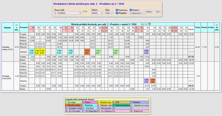 Na konci sestavy jsou celkové součty. Písmeno P v jednotlivých buňkách znamená přítomnost na pracovišti. Místo kódů absencí je opět možné vypisovat zkratky (symboly) a je možné určit jak musí být krátkodobá absence dlouhá, aby zde byla uvedena. Sestavu je možné vyexportovat např. do Excelu